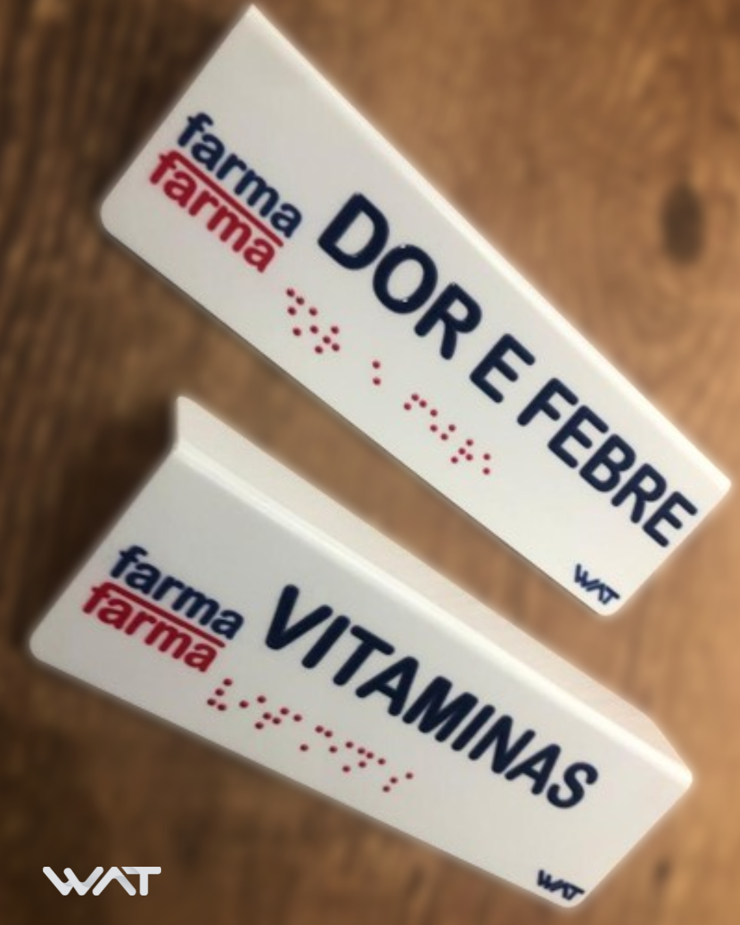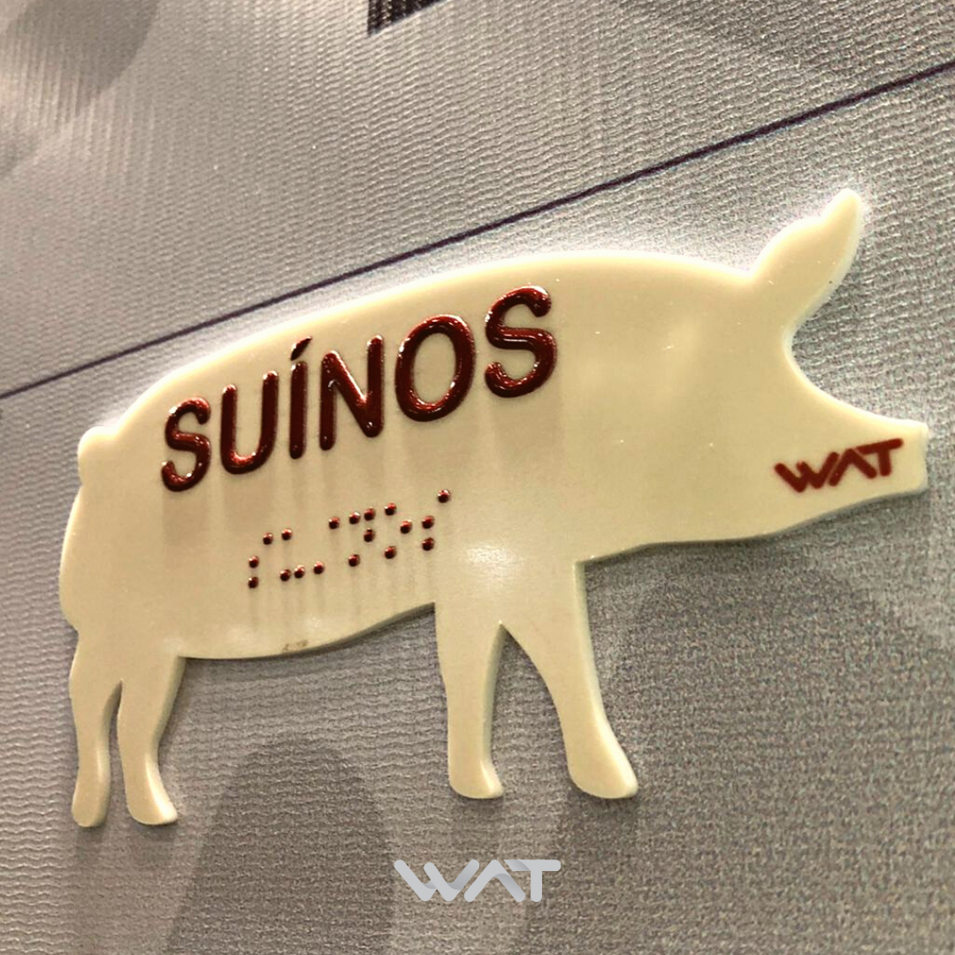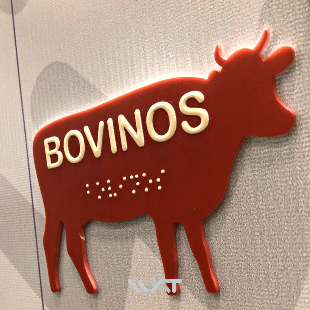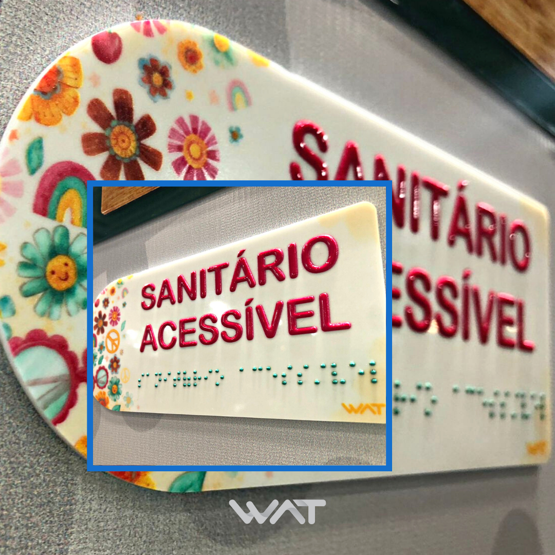 As placas braille podem ser customizadas com materiais de cores distintas, além da aplicação de adesivos ou impressões com logotipos ou outros detalhes.